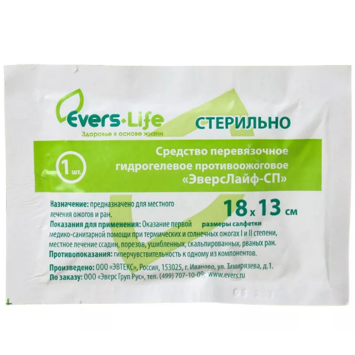 «ЭверсЛайф-СП» представляет собой биологически активный низковязкий гидрогель на основе хитозан-желатинового полиэлектролитного комлекса с иммобилизованными фармсубстанциями декспантенола, лидокаина и хлоргесидина, нанесенный на салфетку из нетканого полотна размером 18х13 см.