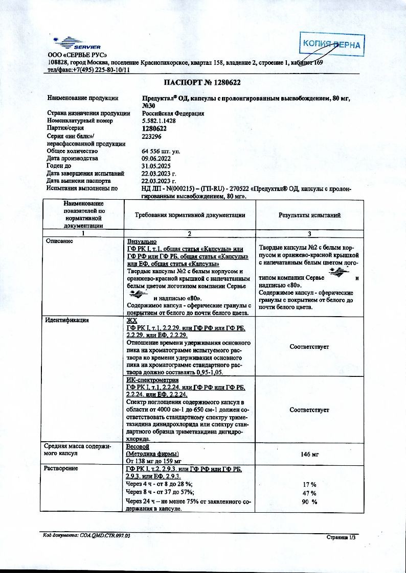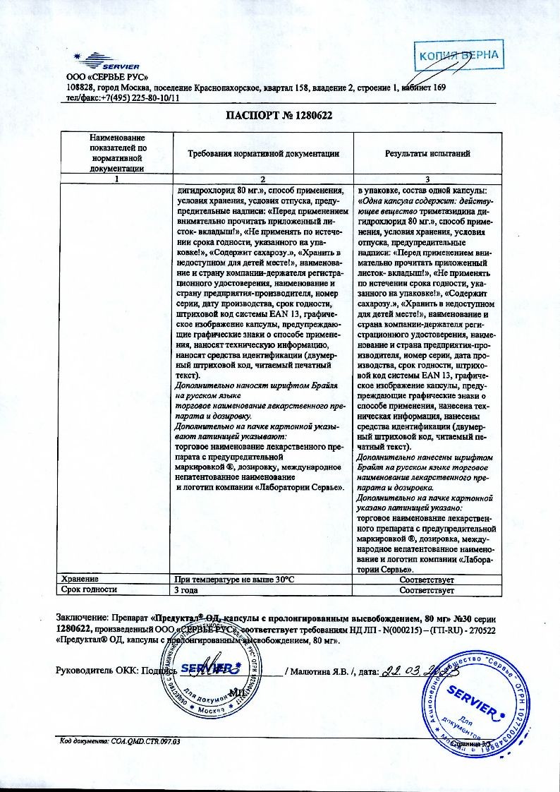 После приема внутрь капсулы Предуктал® ОД триметазидин имеет линейный фармакокинетический профиль и достигает Cmax в плазме крови примерно через 14 ч после приема. В интервалах между приемами препарата (т.е. в течение 24 ч) концентрация триметазидина в плазме крови на протяжении 15 ч после приема препарата сохраняется на уровне не менее 75% от Cmax. Равновесное состояние достигается после приема 3-й дозы (через 3 сут). Прием пищи не влияет на биодоступность триметазидина при приеме препарата Предуктал® ОД 80 мг.