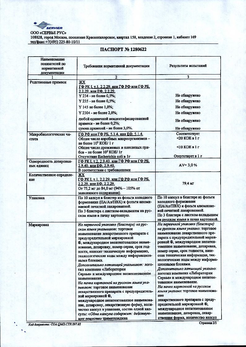 # триметазидина дигидрохлорид, субстанция-гранулы (гранулы, покрытые пленочной оболочкой) - 144.85 мг.