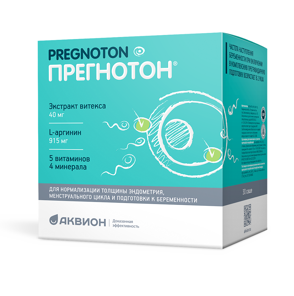 В состав продукта Прегнотон входят витамины, минералы, аминокислота аргинин и экстракт витекса. Эти вещества помогают нормализовать менструальный цикл и работу репродуктивной системы в целом.