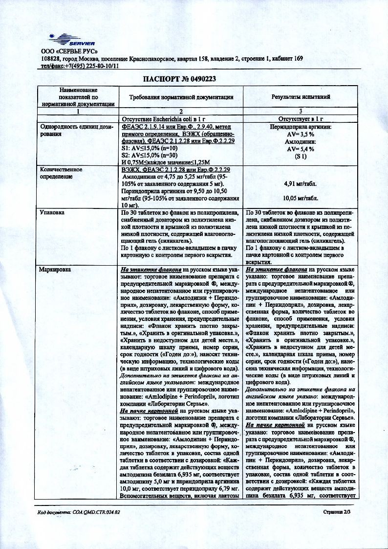 1 таблетка 10 мг + 5 мг: содержит действующих веществ периндоприла аргинина 10 мг, соответствует 6,79 мг периндоприла и амлодипина безилата 6,935 мг, соответствует 5 мг амлодипина.