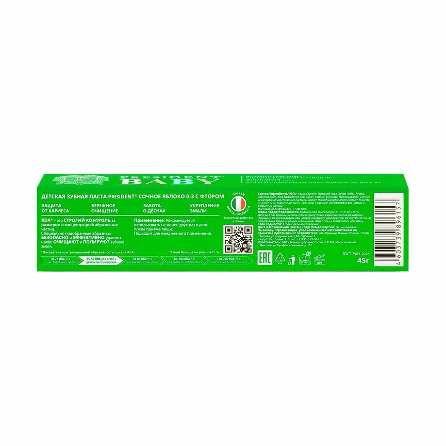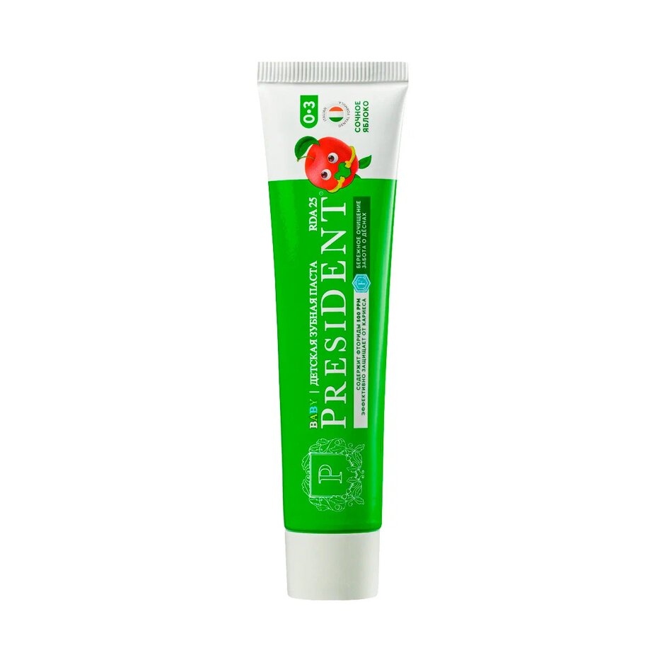Детская зубная паста PRESIDENT® Сочное яблоко от 0 до 3 лет обеспечивает защиту от кариеса, заботу о деснах, укрепление эмали и бережное очищение.