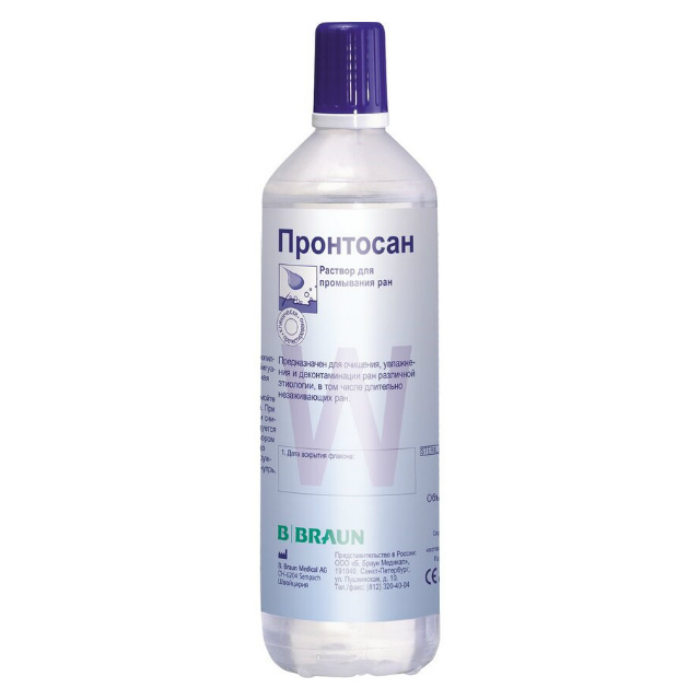 Для промывания больших раневых поверхностей, а также ран в труднодоступных местах рекомендуется обработка всего пораженного органа или части тела раствором Пронтосан в течение не менее 15 минут.