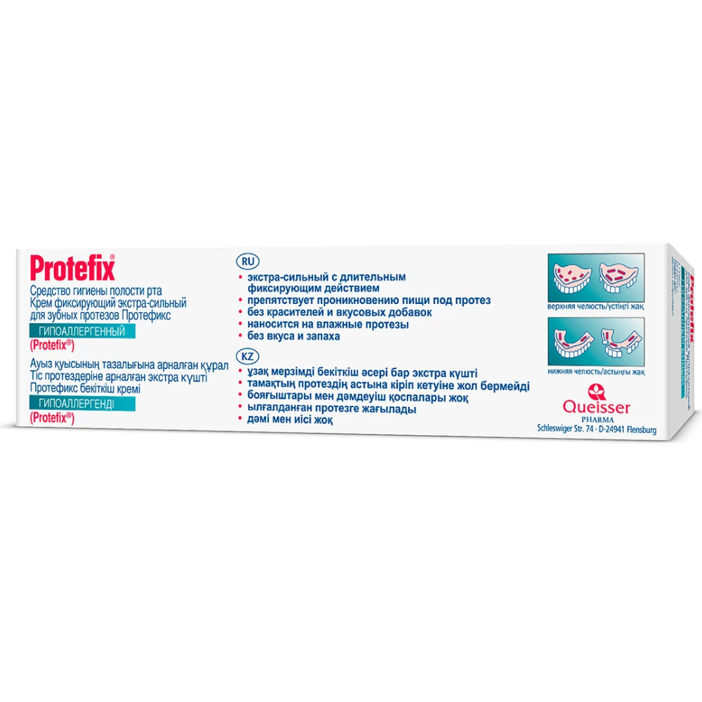 Фиксирующий крем Protefix (Протефикс) Гипоаллергенный не содержит красителей и вкусовых добавок. Рекомендуется для надежной фиксации зубных протезов при повышенном и нормальном слюноотделении. Он легко наносится, сохраняет свои свойства под воздействием горячей и холодной пищи, не меняет вкус еды и напитков, не оказывает негативного воздействия на желудок. Не смывается слюной и равномерно распределяется по всей прилагающей к десне поверхности.