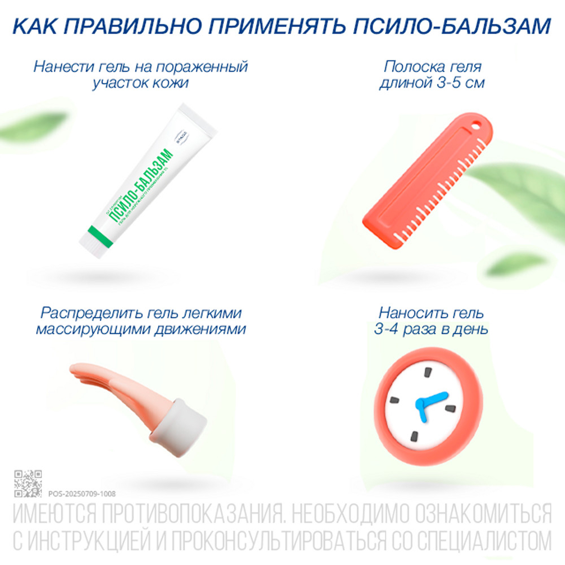 Наружно. Взрослым и детям старше 2 лет Псило-Бальзам наносят на пораженные участки кожи (полоску геля длиной 3-5 см. на площадь поражения размером с ладонь) 3-4 раза в день и распределяют его легкими массирующими движениями.