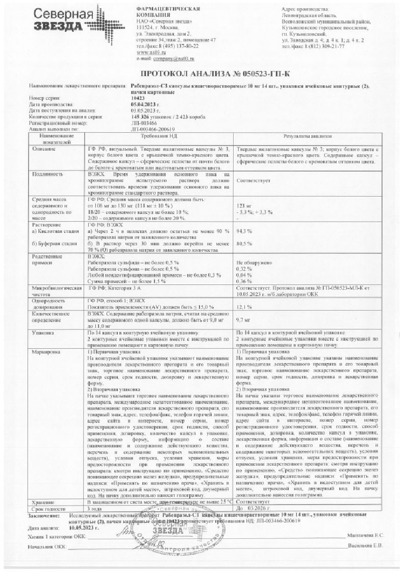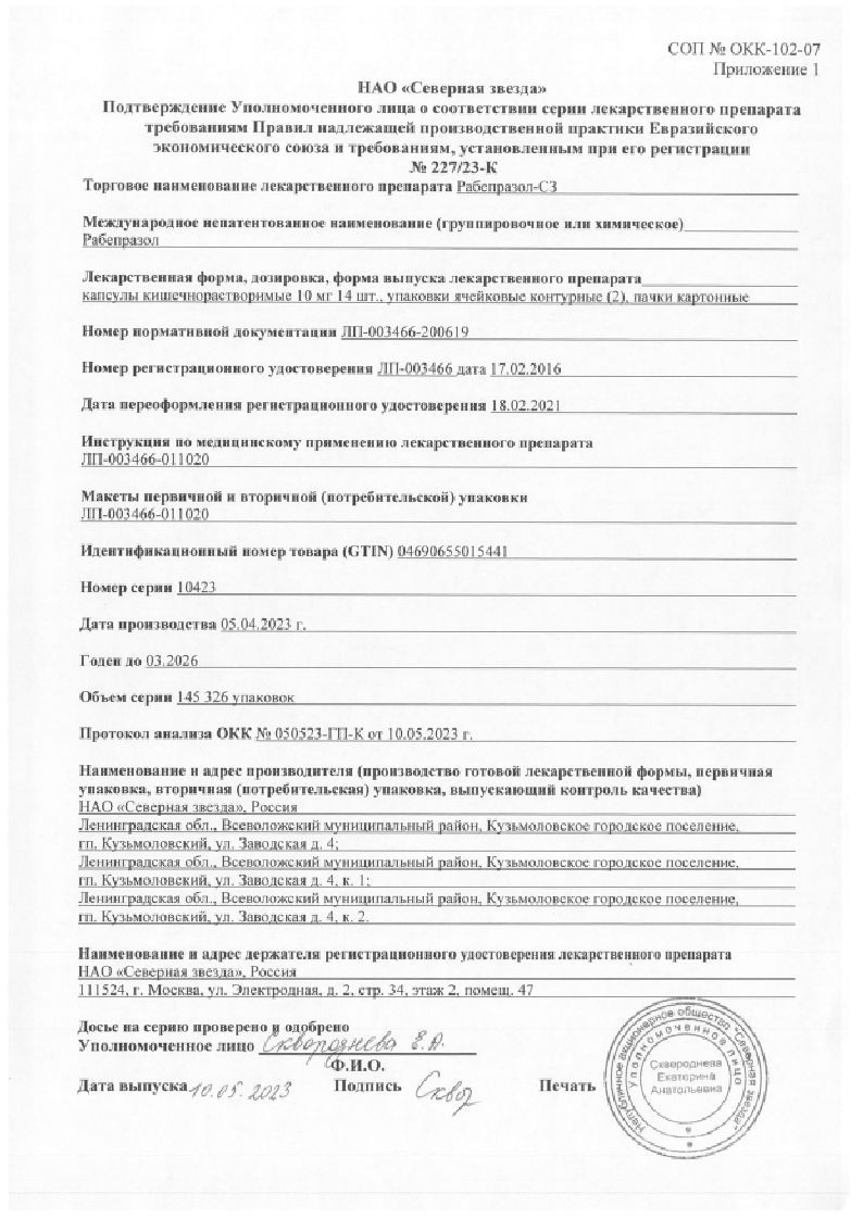 Препарат принимают внутрь, в дозе 10 мг 1 раз/сут. Капсулы следует глотать целиком. Рекомендуется прием препарата утром, перед приемом пищи. Установлено, что ни время суток, ни прием пищи не влияют на активность рабепразола натрия, но рекомендуемое время приема капсул препарата Рабепразол-СЗ способствует лучшему соблюдению пациентами схемы лечения.