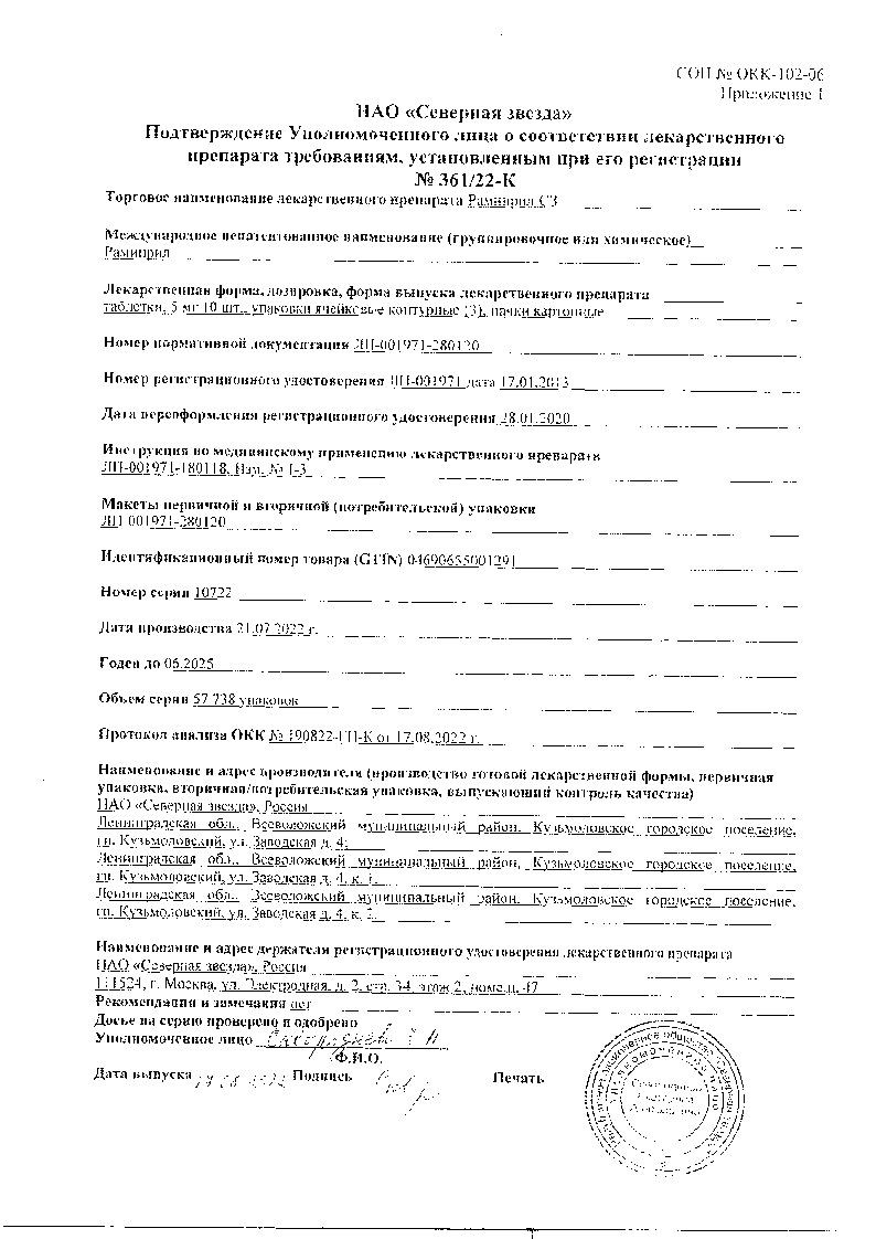 После приема внутрь меченного радиоактивным изотопом рамиприла (10 мг) 39 % радиоактивности выводится через кишечник и около 60 % - почками. После внутривенного введения рамиприла 50-60% дозы обнаруживается в моче в виде рамиприла и его метаболитов. После внутривенного введения рамиприла около 70 % дозы обнаруживается в моче в виде рамиприла и его метаболитов, иначе говоря, при внутривенном введении рамиприла и рамиприлата значительная часть дозы выводится через кишечник с желчью, минуя почки (50 % и 30 %, соответственно). После приема внутрь 5 мг рамиприла у пациентов с дренированием желчных протоков практически одинаковые количества рамиприла и его метаболитов выделяются почками и через кишечник в течение первых 24 часов после приема.