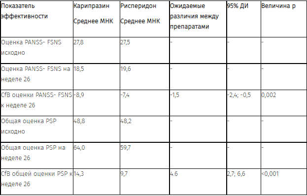 В исследовании негативной симптоматики ЭПС были выявлены у 14,3% пациентов в группе карипразина и у 11,7% пациентов в группе рисперидона. Акатизия наблюдалась у 10,0% пациентов, получавших карипразин, и у 5,2% пациентов, принимавших рисперидон. Паркинсонизм отмечался у 5,2% и 7,4% пациентов в группах карипразина и рисперидона, соответственно. В большинстве случаев ЭПС были легкой или средней степени тяжести и устранялись обычными лекарственными препаратами для лечения ЭПС. Частота отмены лечения вследствие НЛР, связанных с ЭПС, была низкой.