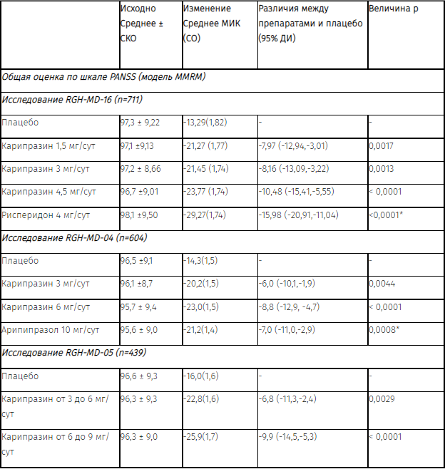 В краткосрочных исследованиях в группе карипразина отмечалось несколько более выраженное увеличение массы тела по сравнению с группой плацебо: 1 кг и 0,3 кг, соответственно. В долгосрочном исследовании сохранения терапевтического эффекта не отмечалось клинически значимых различий изменения исходной массы тела к концу периода лечения (1,1 кг в группе карипразина и 0,9 кг в группе плацебо). В открытой фазе исследования в течение 20 недель приема карипразина у 9,0% пациентов развилось потенциально клинически значимое увеличение массы тела (то есть увеличение не менее чем на 7%), тогда как в двойной слепой фазе потенциально клинически значимое увеличение массы тела наблюдалось у 9,8% пациентов, продолживших прием карипразина, в сравнении с 7,1% пациентов, рандомизированных в группу плацебо после 20 недель приема карипразина в открытом режиме. В исследовании негативной симптоматики среднее изменение массы тела составило -0,3 кг при приеме карипразина и +0,6 кг при приеме рисперидона, а потенциально клинически значимое увеличение массы тела наблюдалось у 6% пациентов в группе карипразина и у 7,4% в группе рисперидона.