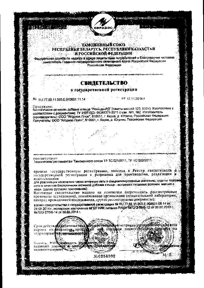 В составе «Рекицена-РД» - до 44% углеводов (из них 31,2% крахмала), до 17, % белков (в т.ч. более 18 видов незаменимых аминокислот), 11, 9 % клетчатки, 2,3% жиров, 1,3% нуклеиновых кислот, 0,15 % пектинов.