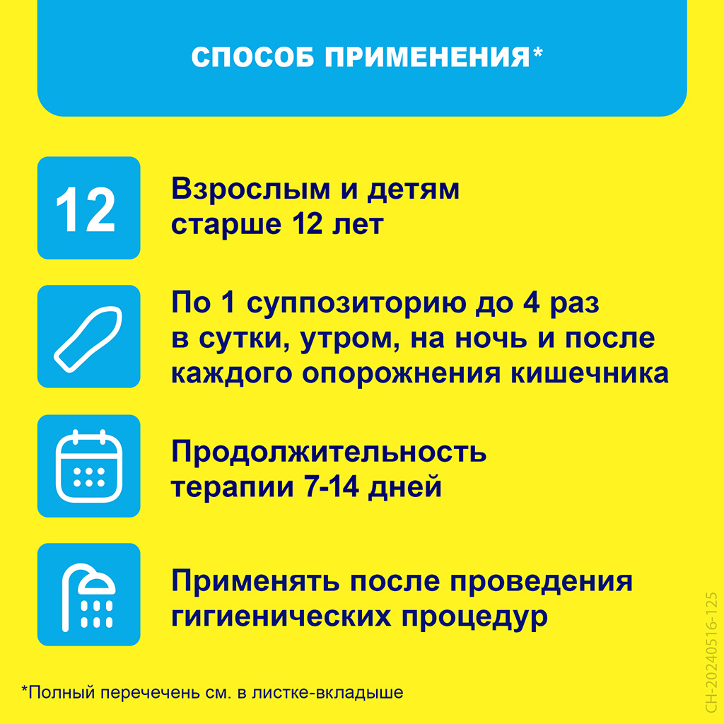 Ректально по 1 суппозиторию утром, на ночь и после каждого опорожнения кишечника до 4 раз/сут в течение 7-14 дней.