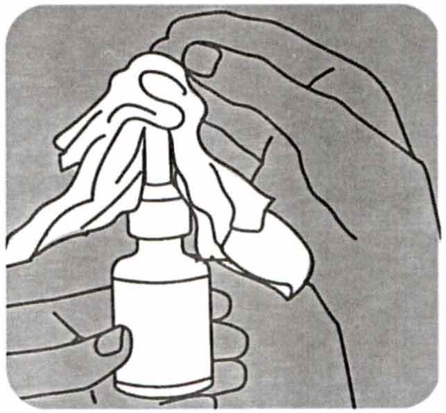 После очистки обратитесь к приведенному пункту «Заполнение дозирующего устройства препарата Риалтрис перед первым применением» и заново подготовьте дозирующее устройство, сделав 2 распыления. Закройте флакон защитном колпачком, и препарат Риалтрис готов к применению.