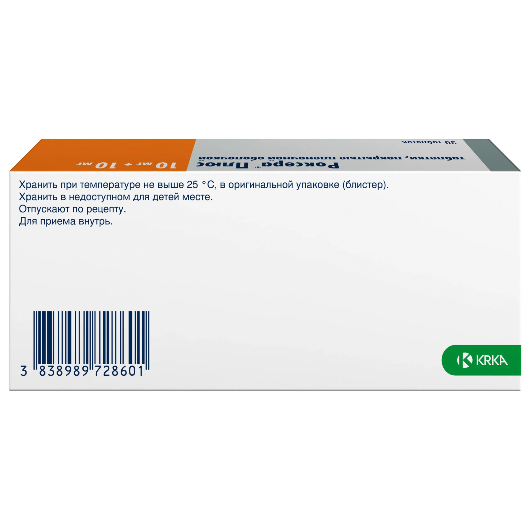 Смесь для покрытия: готовая смесь для использования, содержащая лактозу моногидрат, гипромеллозу, титана диоксид (Е171), триацетин; краситель железа оксид желтый (Е172) (для таблеток 10 мг + 10 мг), краситель железа оксид красный (Е172) (для таблеток 20 мг + 10 мг и 40 мг + 10 мг), краситель железа оксид черный (Е172) (для таблеток 40 мг + 10 мг).