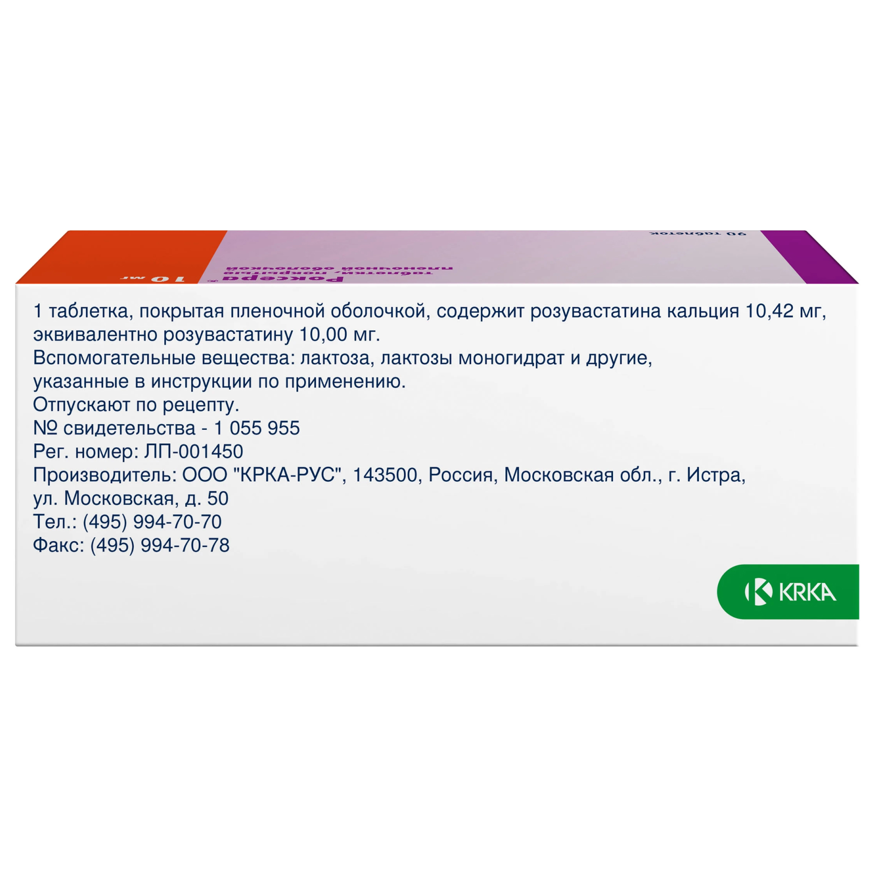 Активное вещество: Розувастатин кальция 10,42 мг, эквивалентно розувастатину 10,00 мг
