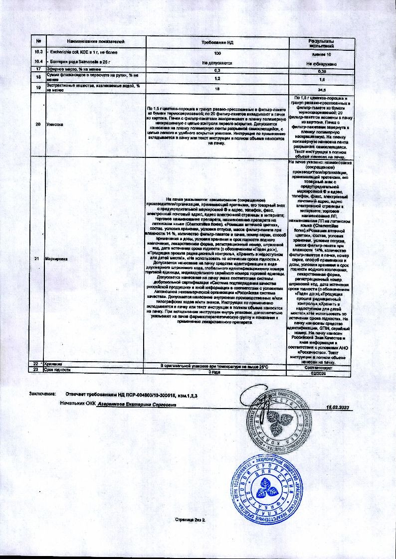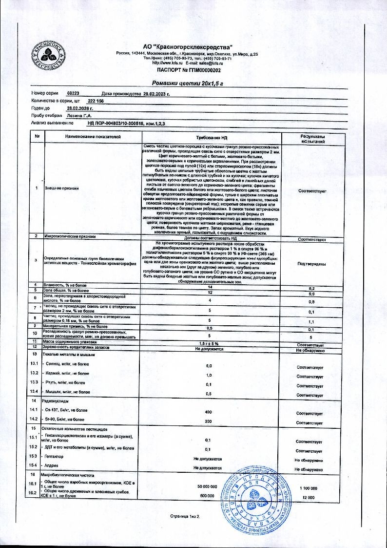 Ромашки цветков порошка – 80 % Ромашки цветков резано-прессованных – 20 %. Цветки ромашки содержат эфирное масло, флавоноиды, кумарины и другие биологически активные вещества