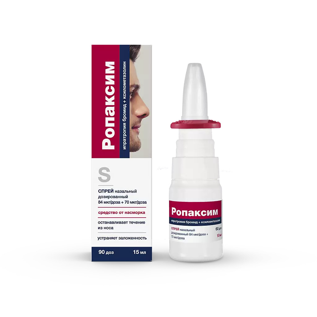 Одно впрыскивание препарата Ропаксим содержит около 70 мкг ксилометазолина гидрохлорида и 84 мкг ипратропия бромида.