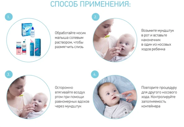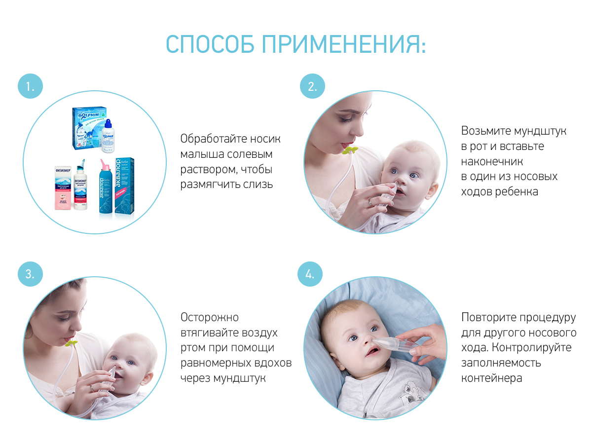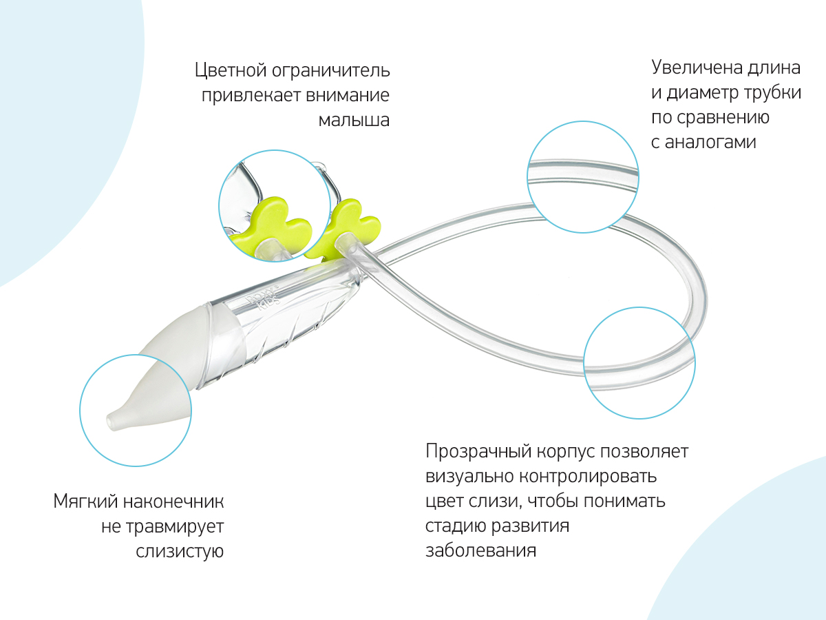 Чтобы воспользоваться аспиратором, поднесите мундштук к губам, а мягкий наконечник к носовому проходу малыша. Плавно вдохните, чтобы вытянуть слизь из носа. Повторите с другой ноздрей. Прозрачный корпус позволит сразу же оценить результат.
