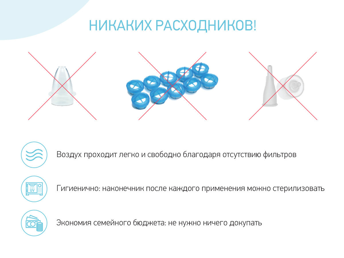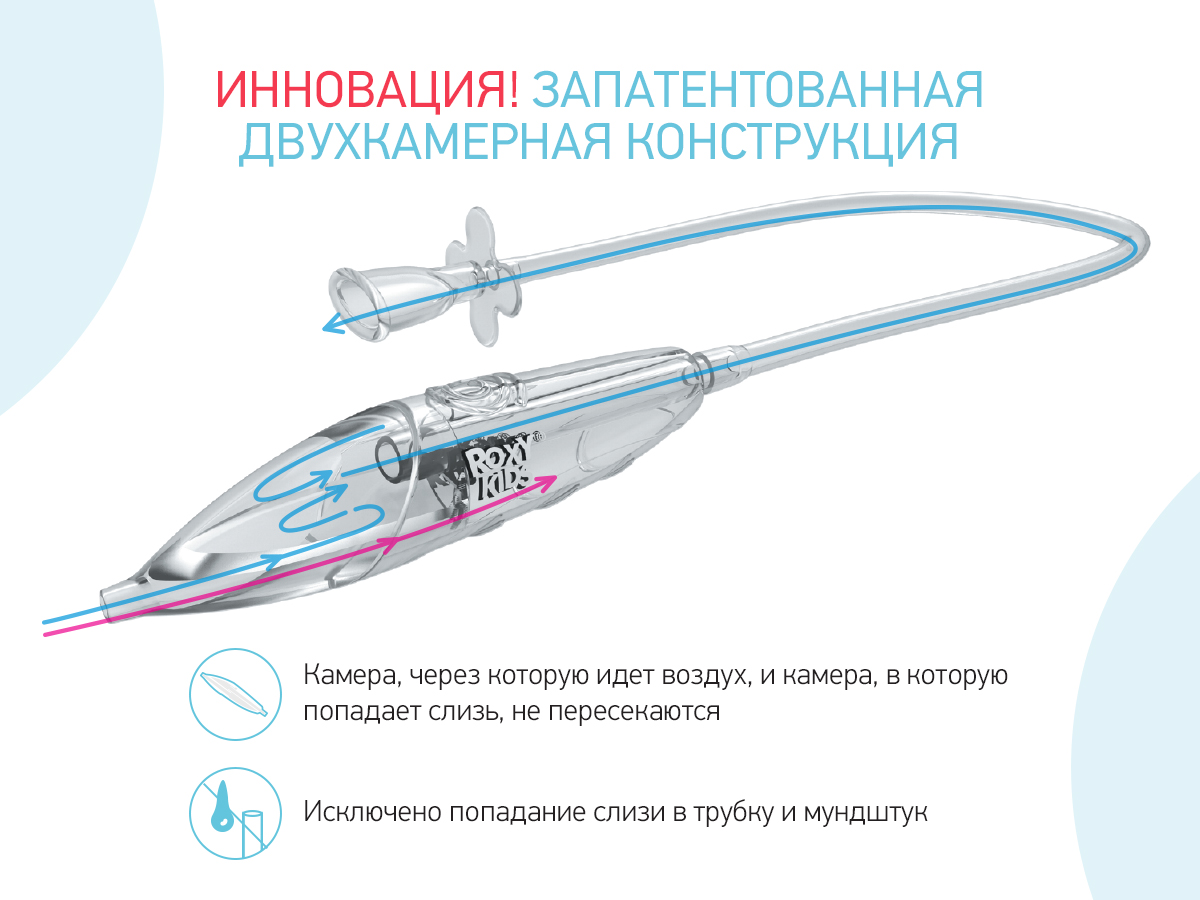 - запатентованная двухкамерная конструкция: камера, через которую идет воздушный поток, и камера, в которую попадает слизь, не пересекаются, это полностью исключает попадание выделений в трубку, поэтому не нужны никакие фильтры;