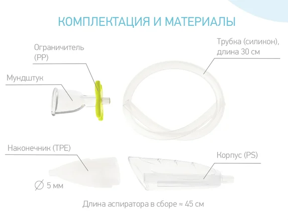 - все материалы абсолютно безопасны и гипоаллергенны: полистирол (корпус и мундштук), термоэластопласт (наконечник), полипропилен (ограничитель), медицинский силикон (трубка);