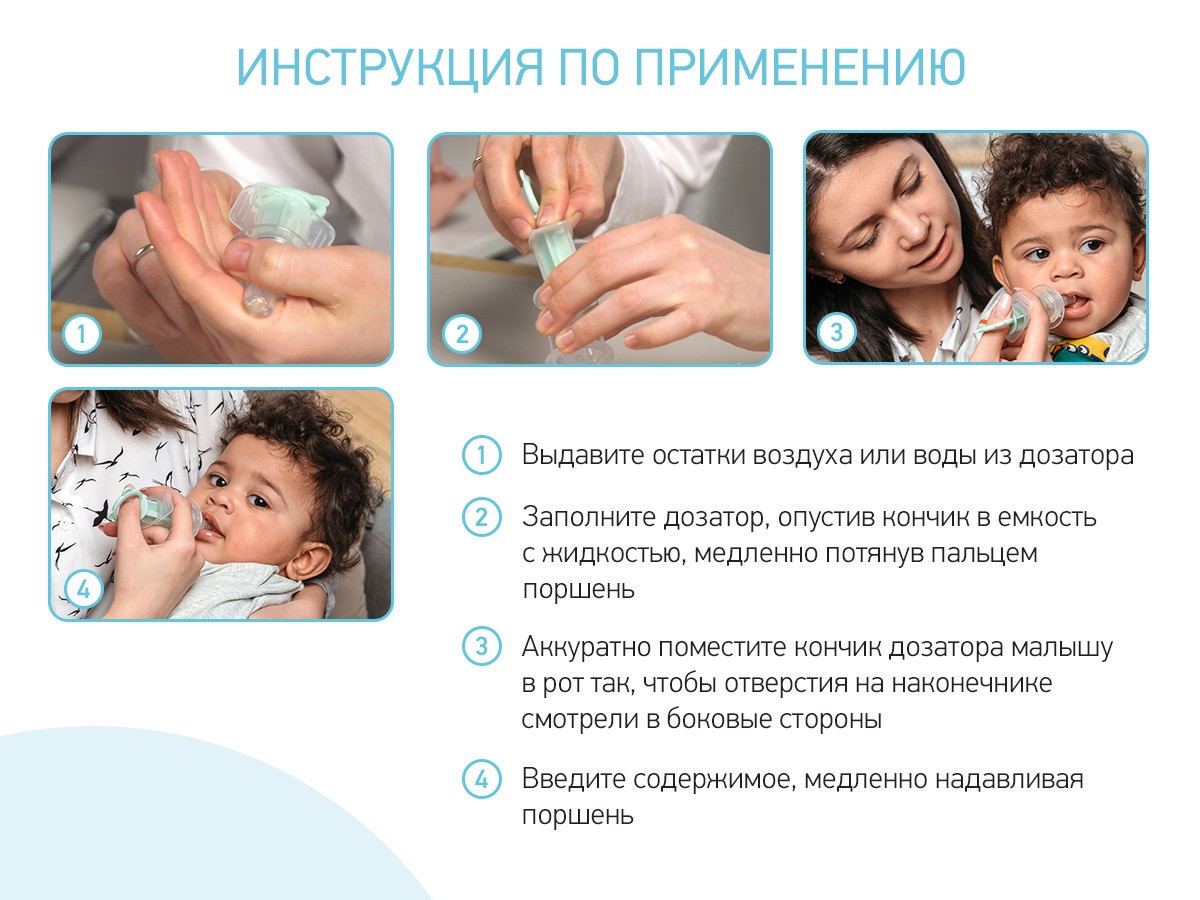 - Аккуратно поместите кончик дозатора малышу в рот так, чтобы отверстия на наконечнике смотрели в боковые стороны;