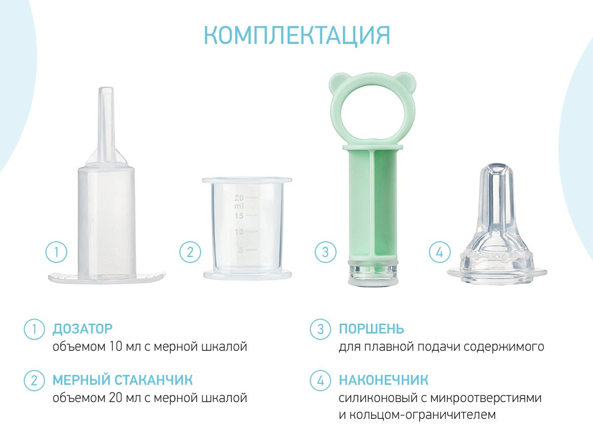 - Дозатор сделан из 100 % силикона и безопасных материалов, не травмирует слизистую полости рта ребенка;