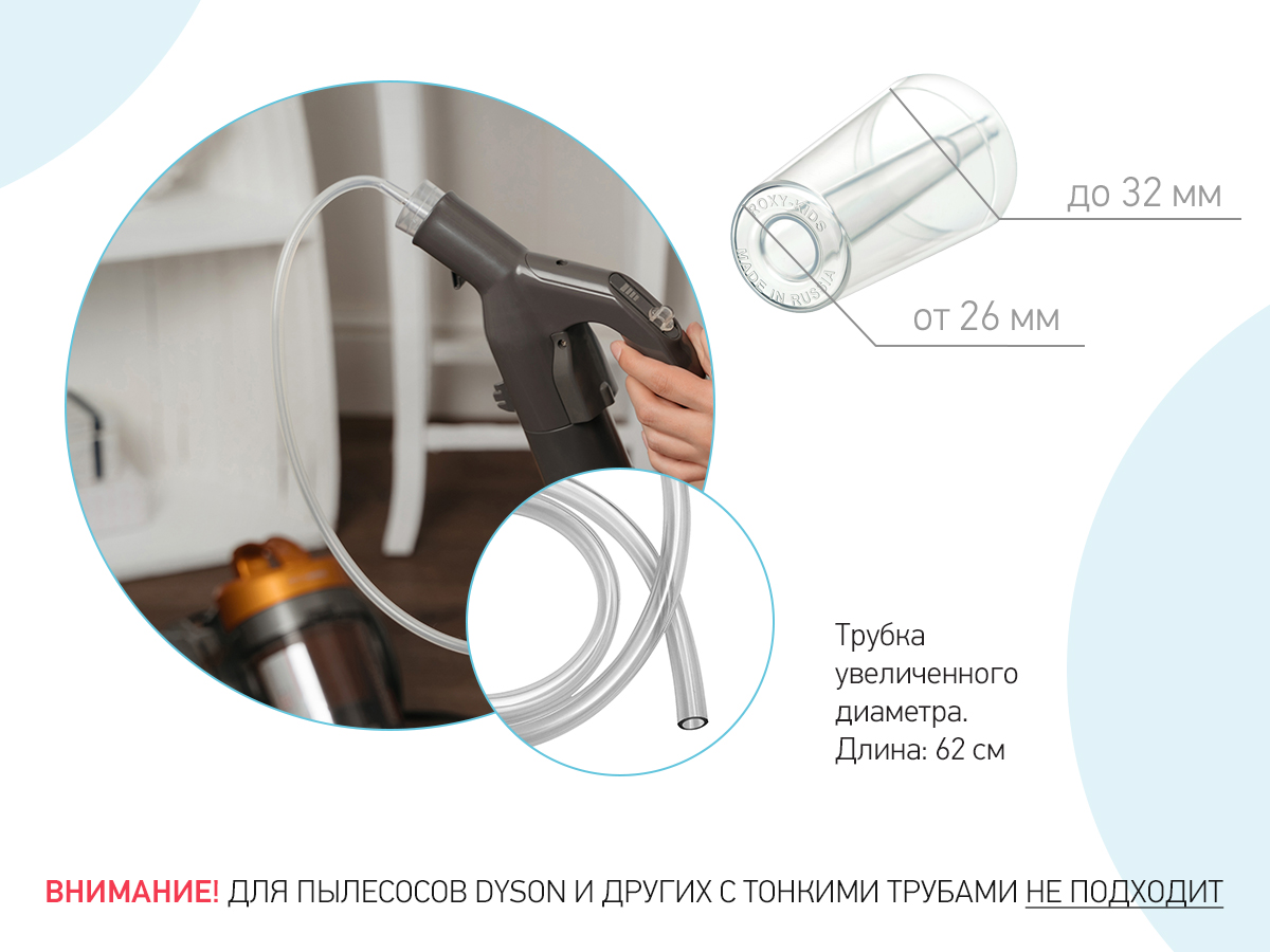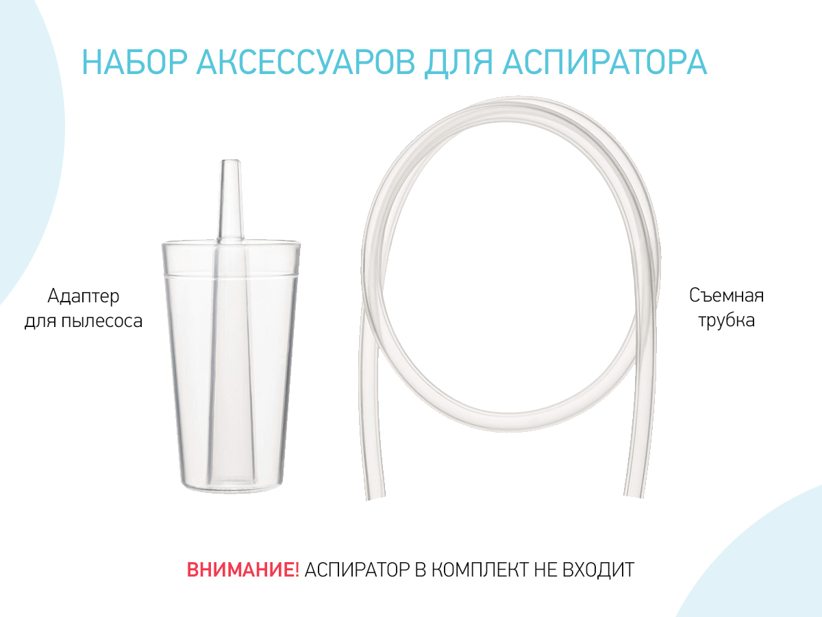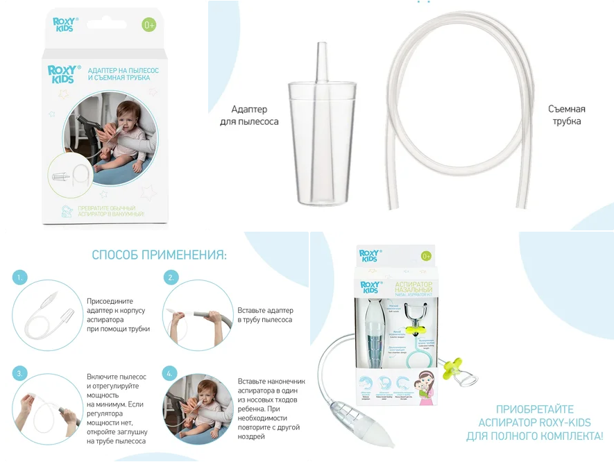 Адаптер для пылесоса и силиконовая трубка увеличенной длины позволяют превратить механический аспиратор с мягким наконечником ROXY-KIDS в вакуумный. Мундштук и короткая трубка меняются на адаптер и длинную трубку, и устройство подключается к обычному домашнему пылесосу. Маме больше не нужно чистить носик малыша при помощи собственного дыхания.