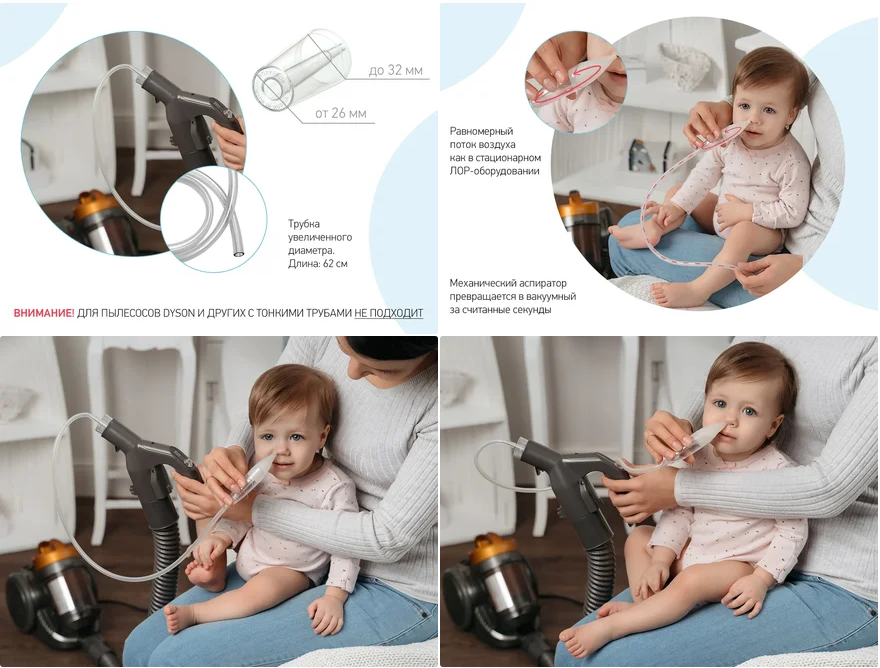 - пылесос создает равномерный поток воздуха, который вытягивает слизь по принципу работы медицинских приборов;