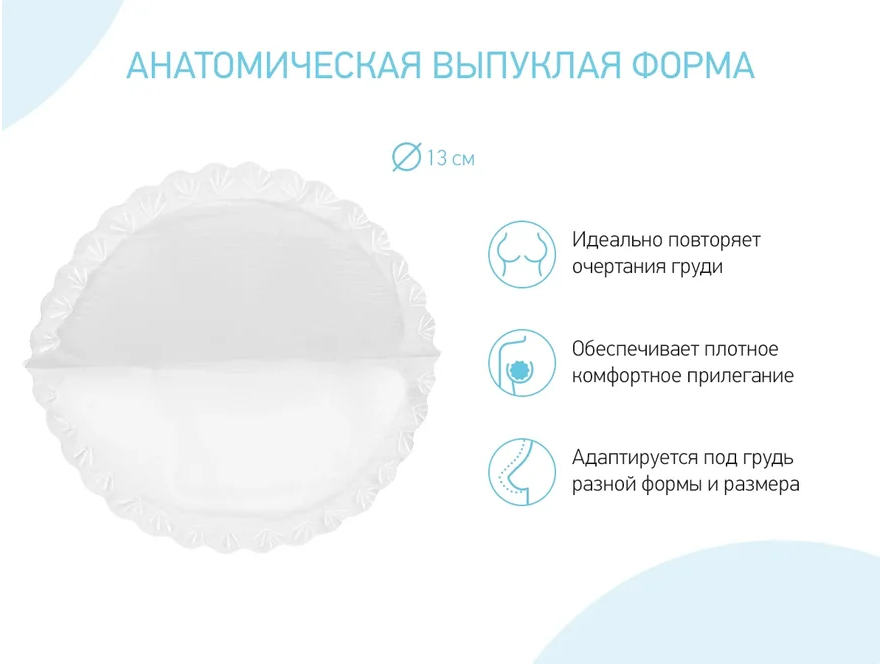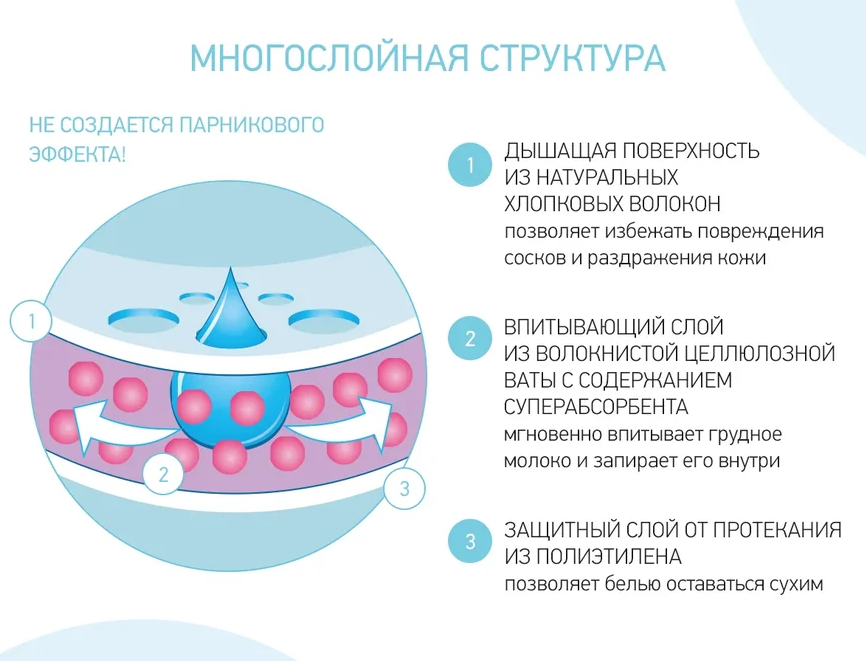 Впитывающие прокладки для груди – незаменимый предмет личной гигиены для молодой мамы. Прокладки удобно крепятся к бюстгальтеру с помощью двойного клейкого слоя, 3D-форма обеспечивает плотное прилегание к груди, а мягкая текстура прокладок не раздражает кожу. Современный японский суперабсорбент отлично впитывает жидкость и оставляет поверхность груди сухой. Внешняя поверхность препятствует попаданию влаги на одежду и при этом позволяет коже дышать.