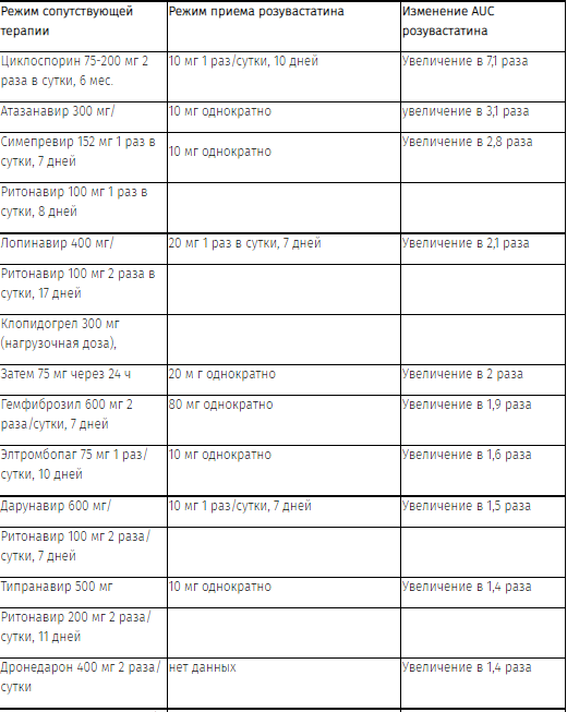 Таблица 1. Влияние сопутствующей терапии на экспозицию к розувастатину (AUC, данные приведены в порядке убывания)