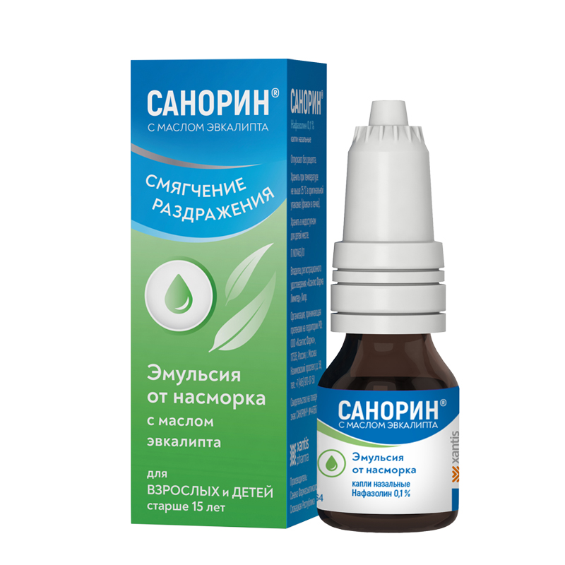 Симптомы: длительное или частое введение препарата Санорин с маслом эвкалипта в носовую полость может вызвать набухание слизистой оболочки носа и ощущение его заложенности. Опасность передозировки (особенно в случае проглатывания) препарата Санорин с маслом эвкалипта возникает у детей младшего возраста и может вызвать угнетение ЦНС, проявлениями которого являются сонливость, понижение температуры тела, повышение потоотделения, замедление ЧСС, повышение АД или его последующее понижение, крайне редко - кома.