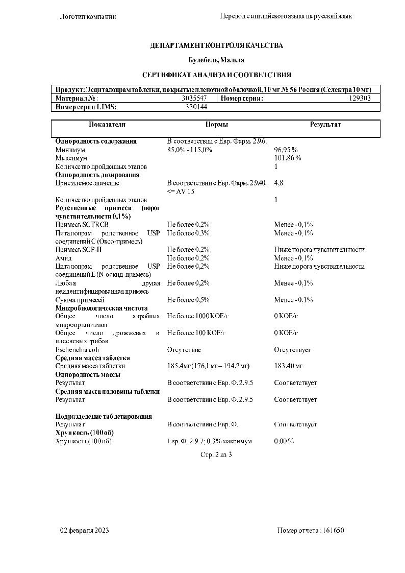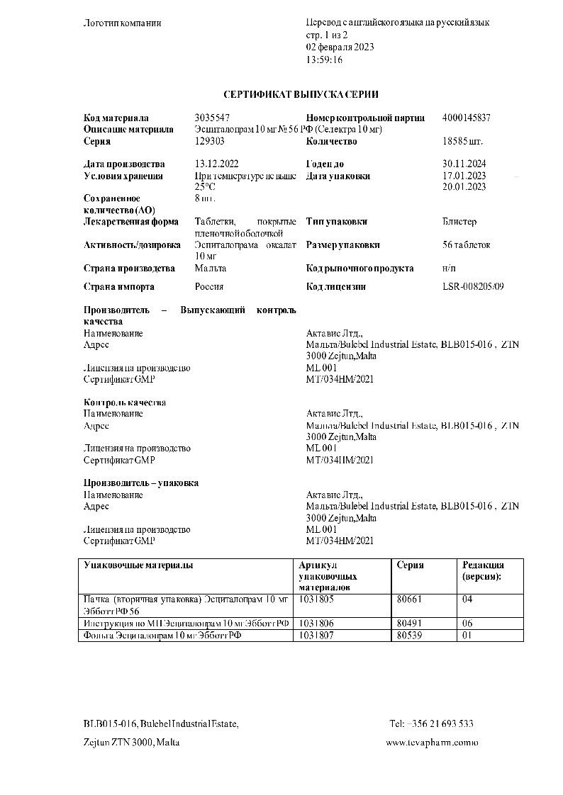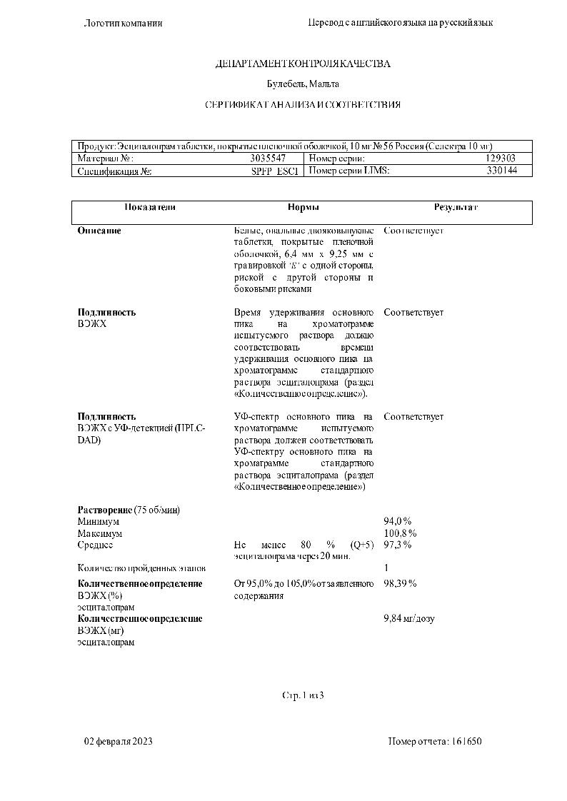 Активное вещество: эсциталопрама оксалат 12.78 мг, что соответствует содержанию эсциталопрама 10 мг.
