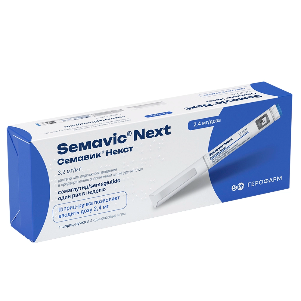 T1/2 семаглутида равен приблизительно 1 неделе. Tmax в плазме составило от 1 до 3 дней после введения дозы лекарственного средства. AUC достигалась спустя 4-5 недель однократного еженедельного применения. После п/к введения семаглутида в дозах 0.5 мг и 1 мг средние показатели его равновесной концентрации у пациентов с СД2 составили около 16 нмоль/л и 30 нмоль/л, соответственно. Экспозиция для доз семаглутида 0.5 мг и 1 мг увеличивается пропорционально введенной дозе. При п/к введении семаглутида в переднюю брюшную стенку, бедро или плечо достигается сходная экспозиция. Абсолютная биодоступность семаглутида после п/к введения составила 89%. Средний объем распределения семаглутида в тканях после п/к введения пациентам с СД2 составил приблизительно 12.5 л. Семаглутид в значительной степени связывался с альбумином плазмы крови (> 99%). Семаглутид метаболизируется посредством протеолитического расщепления пептидной основы белка и последующего бета-окисления жирной кислоты боковой цепи. ЖКТ и почки являются основными путями выведения семаглутида и его метаболитов. 2/3 введенной дозы семаглутида выводится почками, 1/3- через кишечник. Приблизительно 3% от введенной дозы выводится почками в виде неизмененного семаглутида. У пациентов с СД2 клиренс семаглутида составил около 0.05 л/ч. С элиминационным T1/2 примерно 1 неделя семаглутид будет присутствовать в общем кровотоке в течение приблизительно 5 недель после введения последней дозы лекарственного средства.