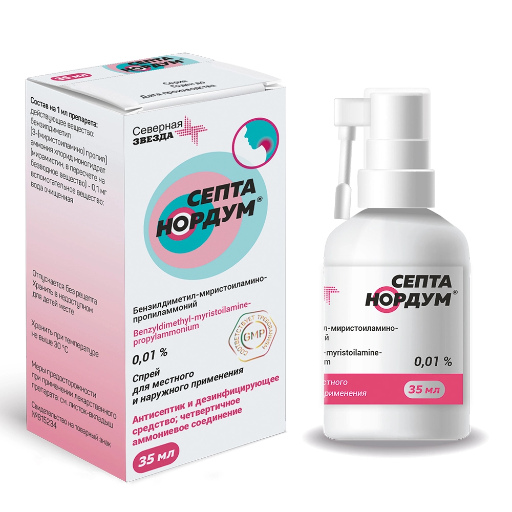Препарат СЕПТА НОРДУМ® содержит Действующим веществом является бензилдиметил-миристоиламино-пропиламмоний. Каждый мл спрея для местного и наружного применения содержит 0,1 мг бензилдиметил-[3-(миристоиламино)пропил] аммония хлорида (в пересчёте на безводное вещество). Вспомогательным веществом является вода очищенная.