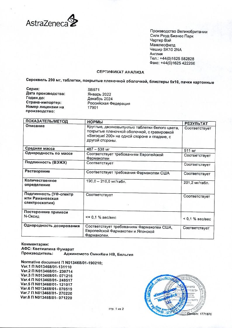 Активное вещество: кветиапин 200мг.