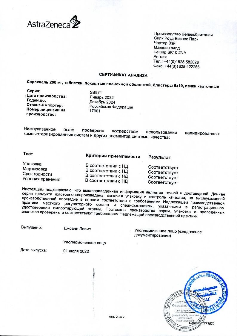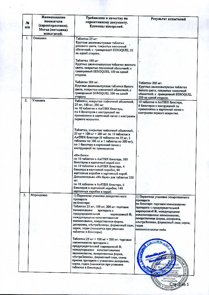 Таблетки, покрытые пленочной оболочкой белого цвета, круглые, двояковыпуклые, с гравировкой "SEROQUEL 200" на одной стороне.