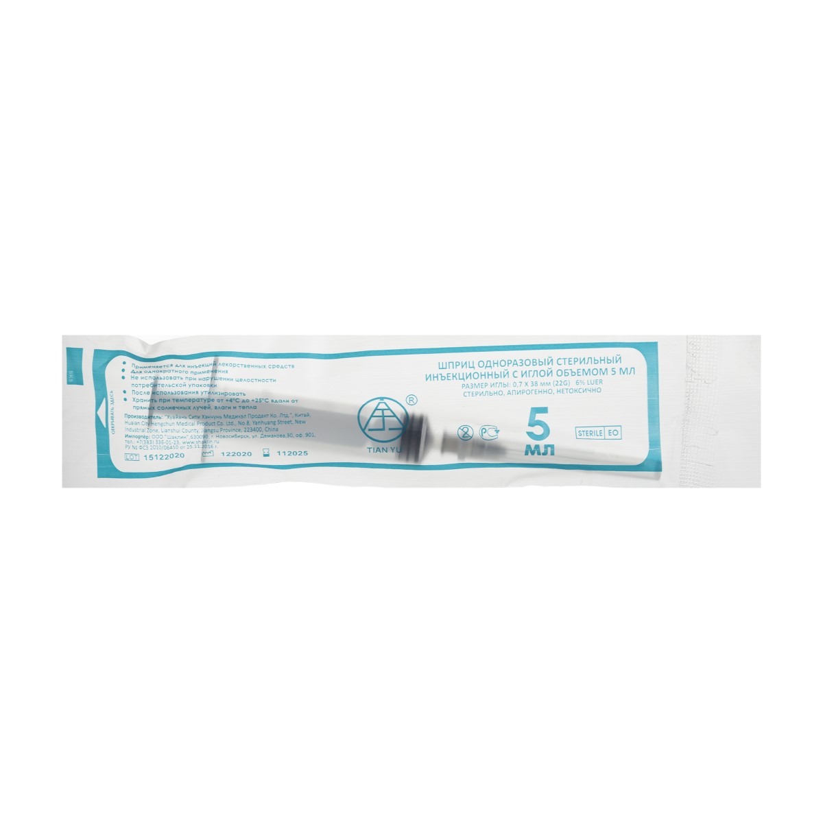 Шприц 5 мл одноразовый трехкомпонентный с иглой 0,7х38мм (22G) стерильный.