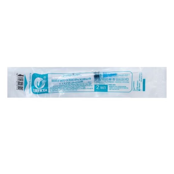 Шприц 2 мл одноразовый трехкомпонентный с иглой 0,6х25 (23G*1) стерильный. Состоит из прозрачного градуированного цилиндра с разъемом LUER-slip, штока-поршня, уплотняющего кольца-манжеты. Каждый шприц выпускается в комплекте с иглой. Прозрачный корпус и четкость градуированной шкалы гарантируют точную дозировку и контроль уровня лекарства, а также легкое выявление случайно попавших воздушных пузырей. Шкала имеет дополнительную градуировку до 2,5 мл. Наличие силиконовой смазки на поршне и внутри полости цилиндра обеспечивает плавность хода. Игла из стали высокого качества имеет тройную лазерную заточку острия, надета на конус. Индивидуальная упаковка «полибэг» из плотного полипропилена обеспечивает видимость шприца до вскрытия упаковки и свидетельствует о ее целостности. Срок годности 5 не менее лет.