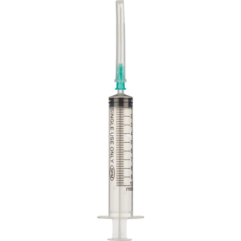 Шприц трехкомпонентный SFM 10 мл 21G (0.8×40 мм). Предназначен для лекарственных инъекций. Шприц с резиновой уплотнительной манжетой на поршне для плавности хода поршня. Трёхгранная лазерная заточка иглы. Игла покрыта и внешне и внутренне слоем специализированного силикона для безболезненной инъекции. Игла надета на шприц. Градуировка на шприце — чёрного цвета. Прозрачная колба поршня. Колба шприца имеет дополнительное стопорное кольцо (поршень не выскакивает при усилии 5 джоулей). Упаковка блистер — сверху полиэтилен, снизу медицинская бумага (для выхода токсичных газов).При вскрытии упаковки не должно быть ворсинок на полиэтилене для обеспечения дополнительной безопасности при вводе медицинского препарата. Полное цветовое соответствие отдельной, внутренней и внешней упаковки. Наличие на упаковке знака ГОСТА Р, РОСТЕСТ, ШТРИХКОДА, СЕ сертификата. Стерилизация — этиленоксид. На корпусе шприца несмываемая шкала с ценой деления 1 мл. Тип наконечника: Luer.