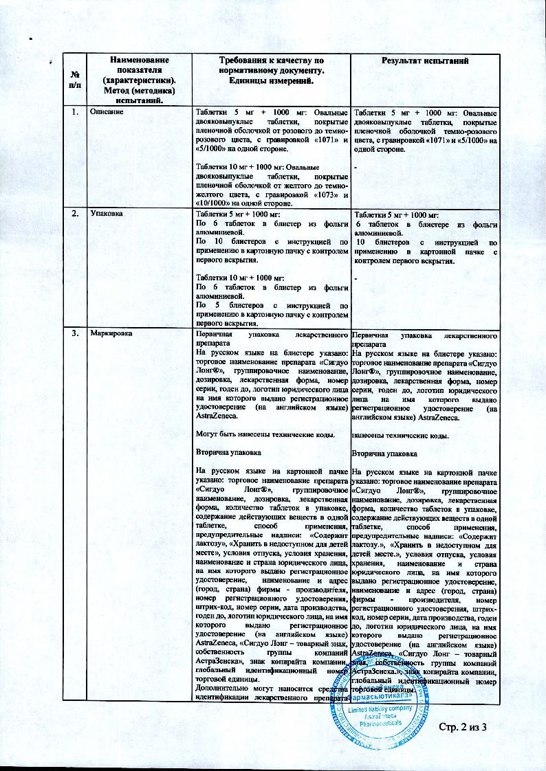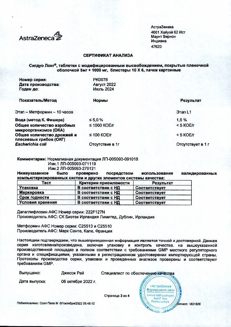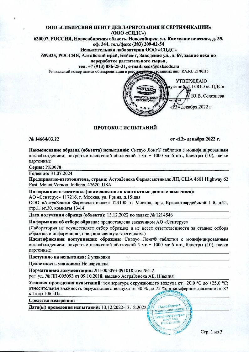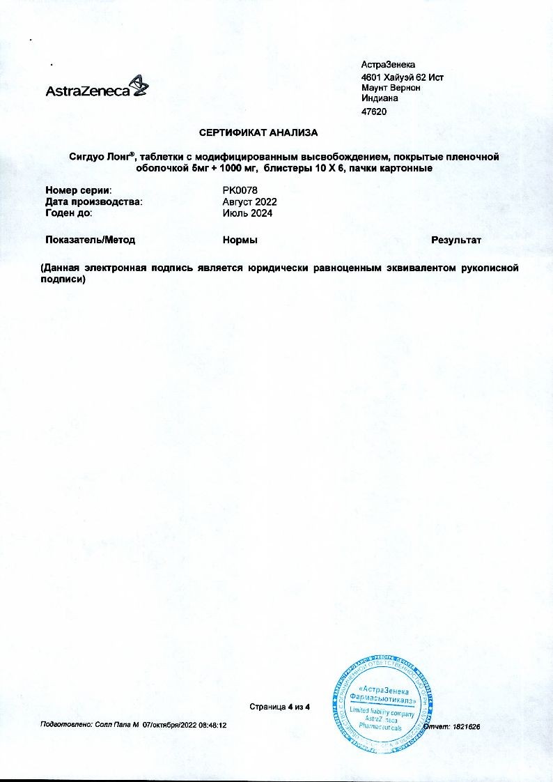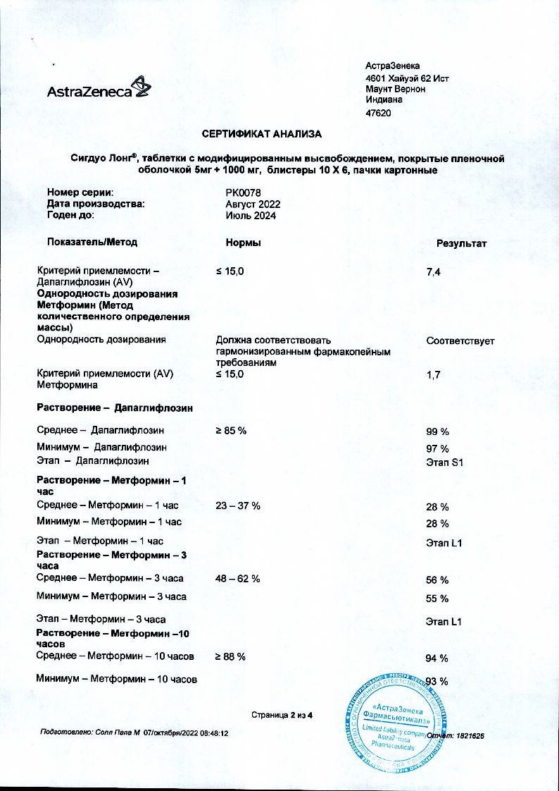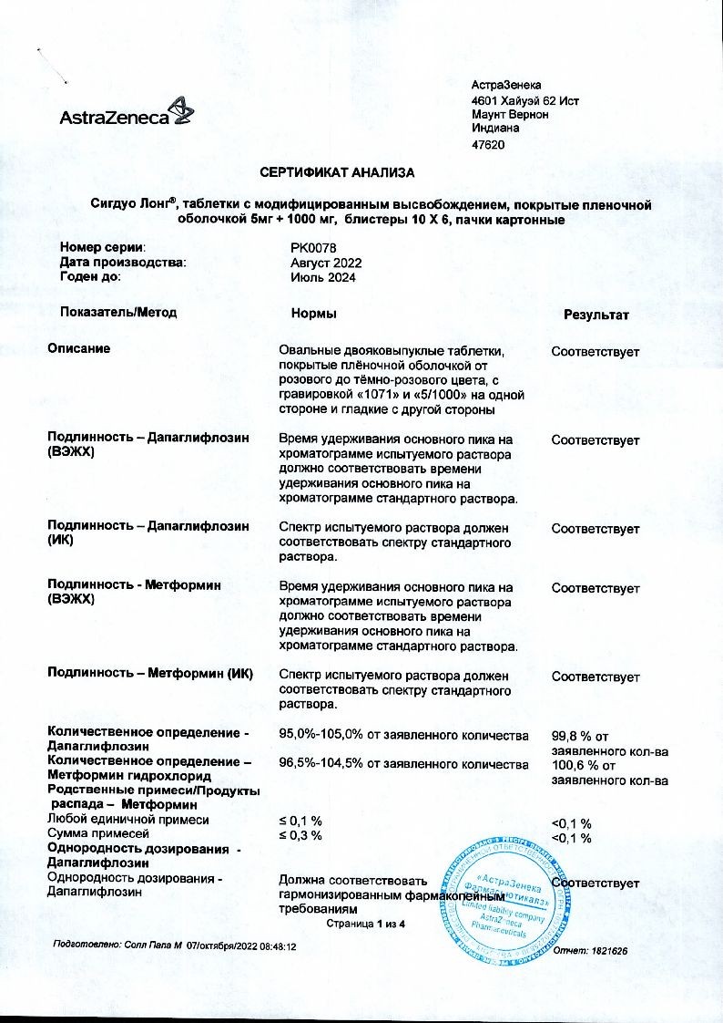 Сигдуо Лонг®, 5 мг + 1000 мг, таблетки с модифицированным высвобождением, покрытые пленочной оболочкой