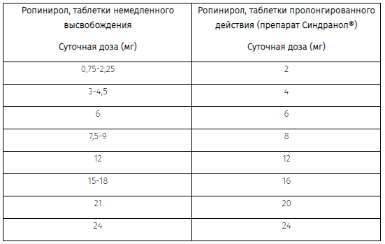 Пациенты могут быть сразу же переведены с терапии таблетками ропинирола с немедленным высвобождением на терапию таблетками пролонгированного действия Синдранол®. Доза ропинирола в препарате Синдранол® должна соответствовать принимаемой суточной дозе ропинирола в таблетках немедленного высвобождения. Рекомендуемые соответствующие дозы препарата Синдранол® (таблетки пролонгированного действия) в случае перехода с терапии таблетками ропинирола немедленного высвобождения представлены в таблице ниже. При приеме другой дозы таблеток ропинирола немедленного высвобождения, не указанной в таблице, пациента следует перевести на ближайшую дозу, указанную в таблице: