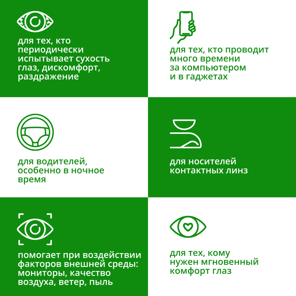 • Облегчает симптомы синдрома "сухого глаза" (такие как чувство жжения и раздражения).