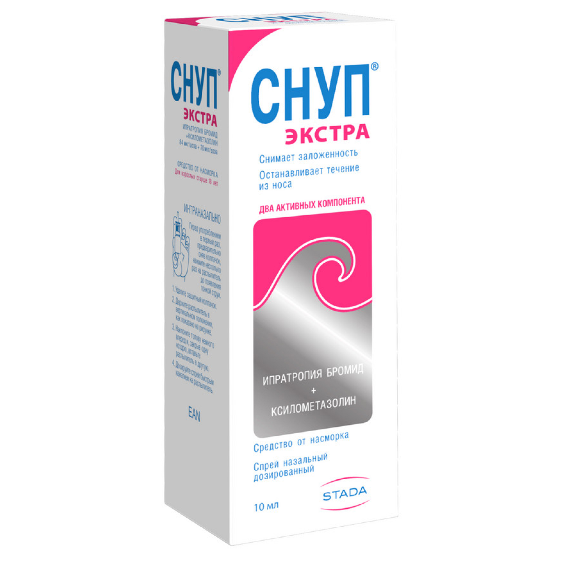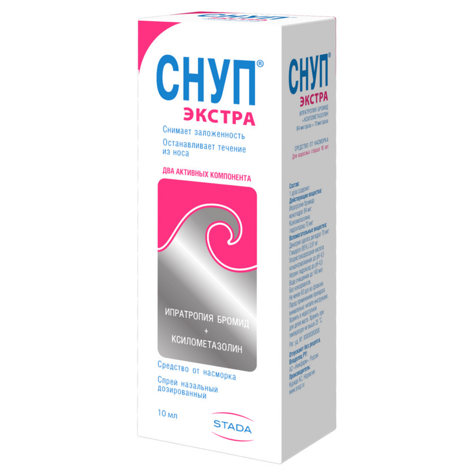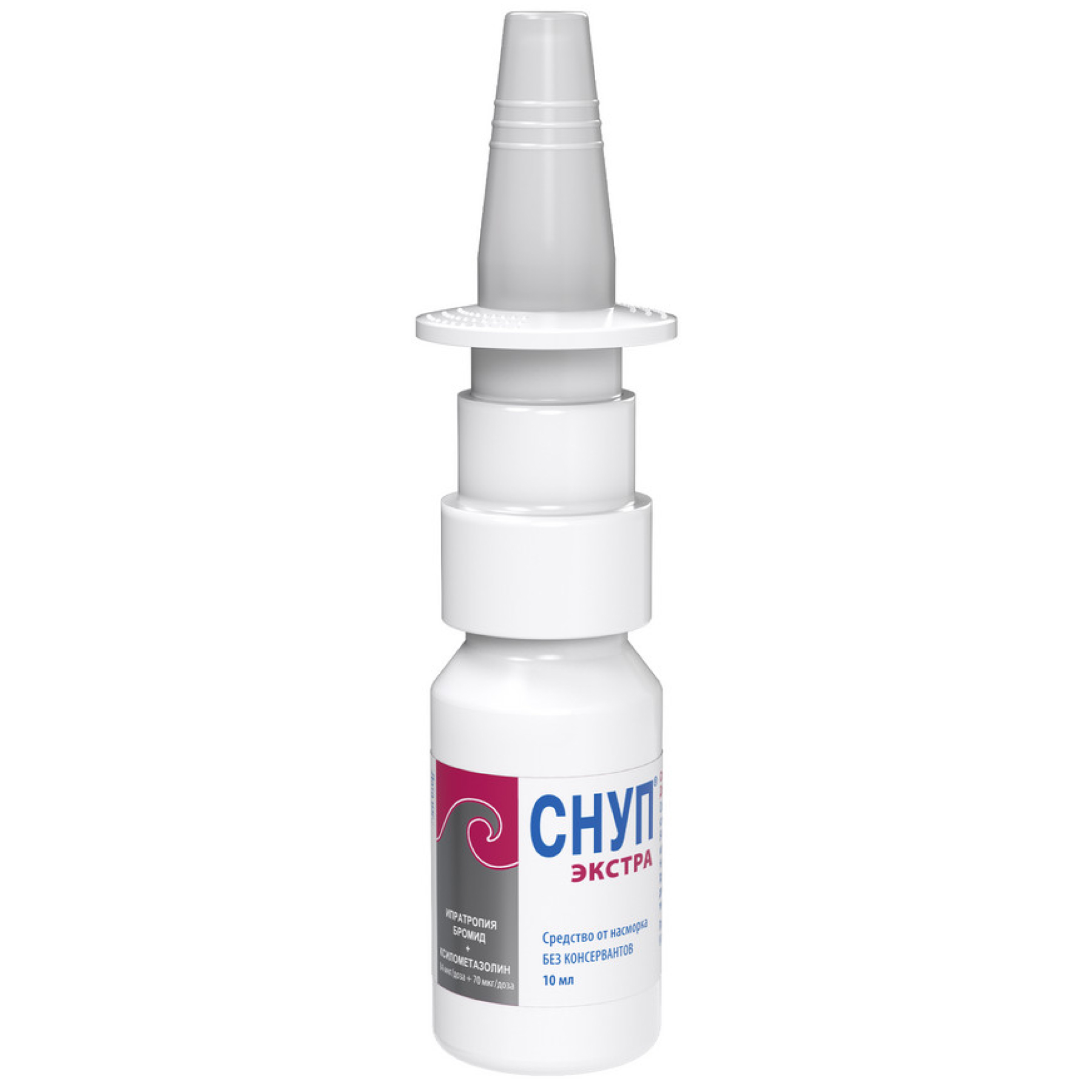 Одно вспрыскивание препарата Снуп® Экстра содержит около 70 мкг ксилометазолина гидрохлорида и 84 мкг ипратропия бромида.