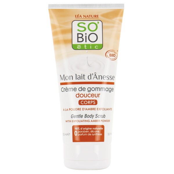 С янтарным порошком. Скраб для тела из линии косметических средств с ослиным молоком Mon lait d'Anesse. С ослиным молоком, соком био алоэ, маслом био ши гарантирует нежное очищение кожи, делая её невероятно мягкой. Деликатно отшелушивает омертвевшие клетки кожи, возвращая ей великолепный внешний вид. 98% всех ингредиентов имеют натуральное происхождение. 20% всех ингредиентов являются продуктами органического земледелия. Экологичная био косметика. Сертифицировано ECOCERT. Без красителей, синтетических отдушек, сульфатов, парабенов, ЭДТА-феноксиэтанола. Биоразлагаемые ингредиенты. Дерматологически тестировано Этот кремовый скраб для отшелушивания кожи, обогащен ослиным молоком, благодаря чему она становится невероятно мягкой. Драгоценные янтарные частицы деликатно отшелушивают мертвые клетки кожи, регенерируя кожу и восстанавливая красоту. Ослиное молочко восстанавливает и смягчает кожу, масло био ши питает, сок био алоэ увлажняет.