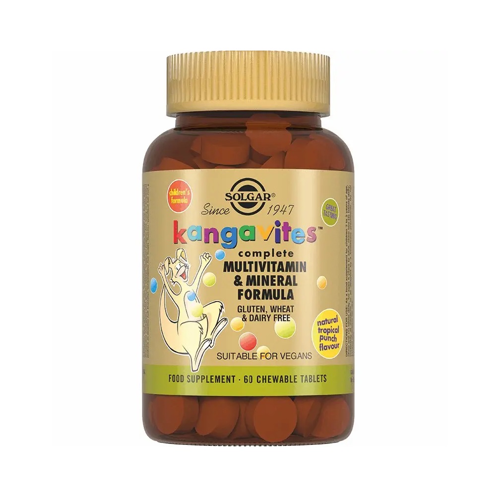 Таблетки для детей «Кангавитес. Комплексная формула мультивитаминов и минералов со вкусом тропических фруктов» (Kangavites Complete Multivitamin & Mineral Formula Chewable Tablets) - это мультивитаминный комплекс состоящий из минералов и витамин для детей в возрасте от 3 лет и старше.