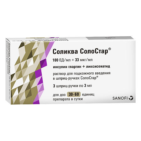 П/к, 1 раз в сутки в течение 1 ч перед любым приемом пищи. Предпочтительно, чтобы прандиальная (перед приемом пищи) инъекция препарата Соликва СолоСтар® проводилась ежедневно перед одним и тем же приемом пищи, выбранным как наиболее подходящий для пациента. В случае пропуска введения дозы препарата Соликва СолоСтар® ее следует ввести в течение 1 ч перед следующим приемом пищи. Для удобства индивидуального подбора дозы препарат Соликва СолоСтар® выпускается в двух шприц-ручках, предоставляющих выбор различных доз. Различия между этими двумя шприц-ручками заключаются в диапазоне доз действующих веществ в шприц-ручках (см. ниже). Соликва СолоСтар® 100 ЕД/мл и 50 мкг/мл: шприц-ручка 10–40 - 1 единица препарата в этой шприц-ручке Соликва СолоСтар® содержит 1 ЕД инсулина гларгин и 0,5 мкг ликсисенатида. Эта шприц-ручка дает возможность получения суточной дозы от 10 до 40 ЕД препарата Соликва СолоСтар® (от 10 до 40 ЕД инсулина гларгин в комбинации с ликсисенатидом в дозе от 5 мкг до 20 мкг). Соликва СолоСтар® 100 ЕД/мл и 33 мкг/мл: шприц-ручка 30–60 - 1 единица препарата в этой шприц-ручке Соликва СолоСтар® содержит 1 ЕД инсулина гларгин и 0,33 мкг ликсисенатида. Эта шприц-ручка дает возможность получения суточной дозы от 30 до 60 единиц препарата Соликва СолоСтар® (от 30 до 60 ЕД инсулина гларгин в комбинации с ликсисенатидом в дозе от 10 мкг до 20 мкг). Во избежание ошибочного введения препарата из другой шприц-ручки (с другой дозировкой), необходимо удостовериться в том, что в рецепте указана соответствующая назначению врача шприц-ручка Соликва СолоСтар®: шприц-ручка Соликва СолоСтар® (10–40) или шприц-ручка Соликва СолоСтар® (30–60). Максимальная суточная доза препарата Соликва СолоСтар® составляет 60 единиц (60 ЕД инсулина гларгин и 20 мкг ликсисенатида). Доза препарата Соликва СолоСтар® должна подбираться индивидуально, на основании клинического ответа, и титроваться исходя из потребности пациента в инсулине. Доза ликсисенатида увеличивается или уменьшается вместе с дозой инсулина гларгин, а также зависит от того, какая из вышеуказанных шприц-ручек используется. Коррекцию дозы или изменение времени введения препарата Соликва СолоСтар® следует проводить только под врачебным наблюдением с соответствующим мониторингом концентрации глюкозы в крови (см. «Особые указания). Начало терапии препаратом Соликва СолоСтар® Начальная доза препарата Соликва СолоСтар® (см. табл. 1) выбирается исходя из предшествующего лечения гипогликемическими препаратами, и не должна превышать начальную дозу ликсисенатида 10 мкг.