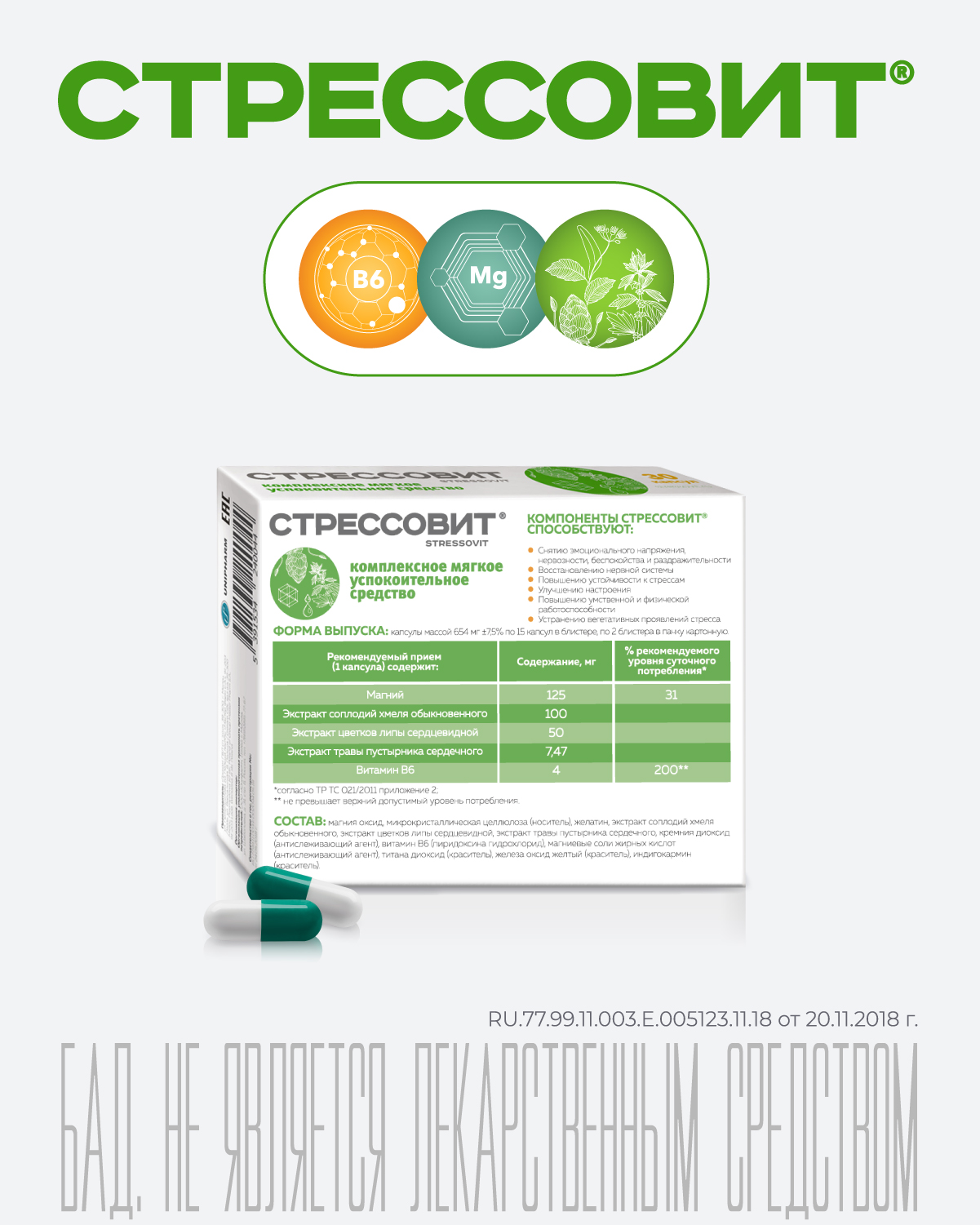 СТРЕССОВИТ – комплекс растительных экстрактов, витамина В6 и магния, обладающий мягким успокоительным действием.