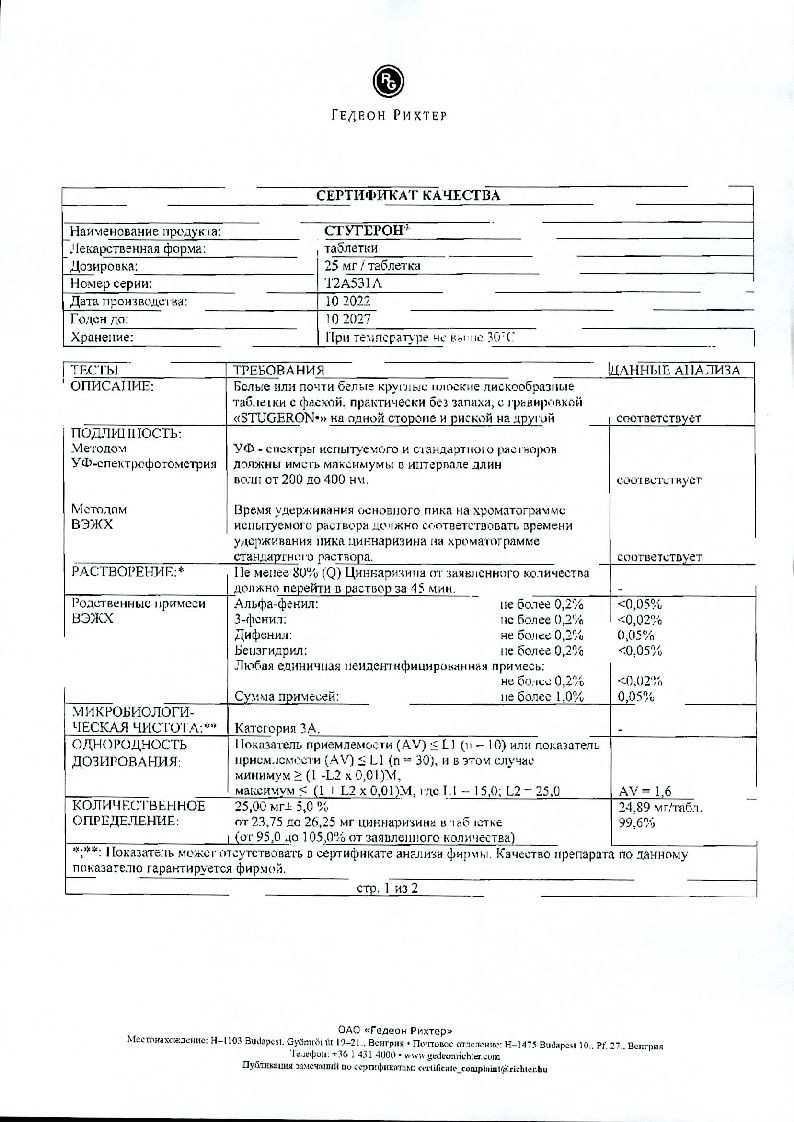 Диагностические вмешательства. В связи с антигистаминным эффектом прием препарата Стугерон® менее чем за 4 дня до проведения кожных диагностических проб может препятствовать выявлению реакций, положительных в отсутствие препарата.