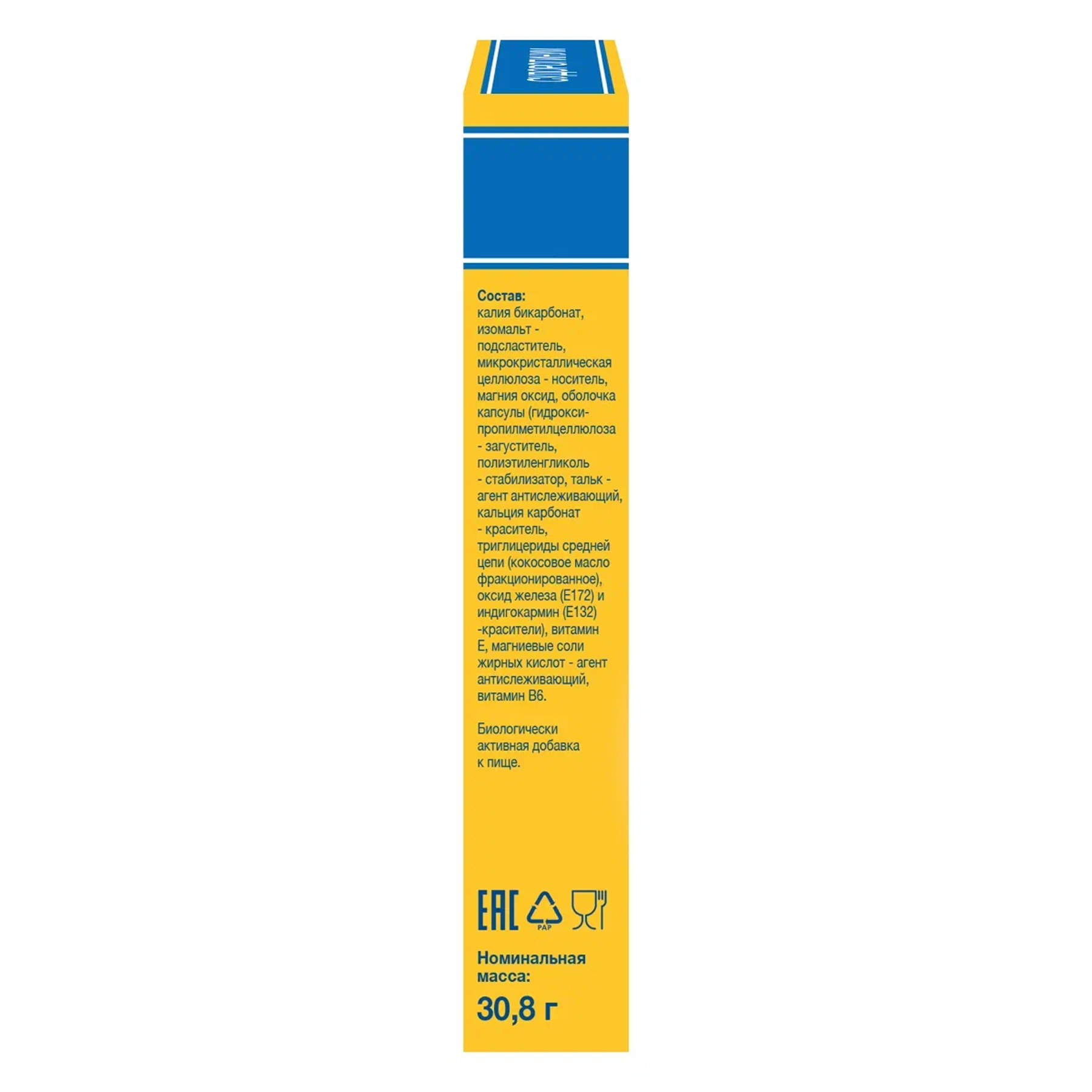 Активные ингредиенты в 1 таблетке: Калий 70 мг Магний 500 мг Витамин B6 1 мг Витамин Е 5 мг Состав: калия бикарбонат, изомальт - подсластитель, микрокристаллическая целлюлоза - носитель, магния оксид, оболочка капсулы (гидроксипропилметил целлюлоза - загуститель, полиэтиленгликоль - стабилизатор, тальк - агент антислеживающий, кальция карбонат - краситель, триглицериды средней цепи (кокосовое масло фракционированное), оксид железа (Е172) и индигокармин (Е132) -красители), витамин E, магниевые соли жирных кислот - агент антислеживающий, витамин В6.