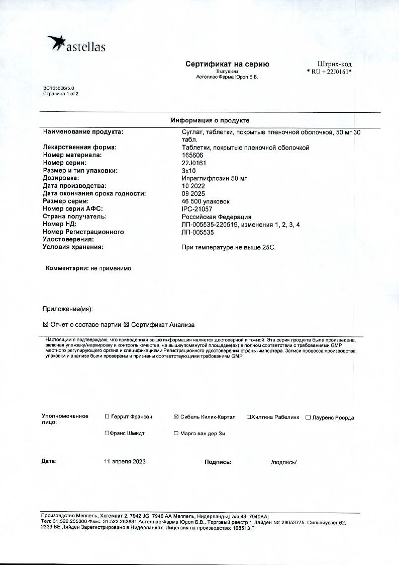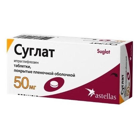 Ипраглифлозин и его метаболиты выводятся почками и через кишечник. После однократного или многократного приема ипраглифлозина внутрь в дозах 50 и 100 мг средний терминальный T1/2 варьирует от 11.7 до 19.9 ч. Общий клиренс составляет 10.9 л/ч, при этом почечный клиренс составляет около 0.1 л/ч. После в/в введения ипраглифлозина только 1.32% введенной дозы выводится почками в неизмененном виде. Во всех исследованиях доля выведения неизмененного ипраглифлозина почками была низкой (<2% от принятой дозы).
