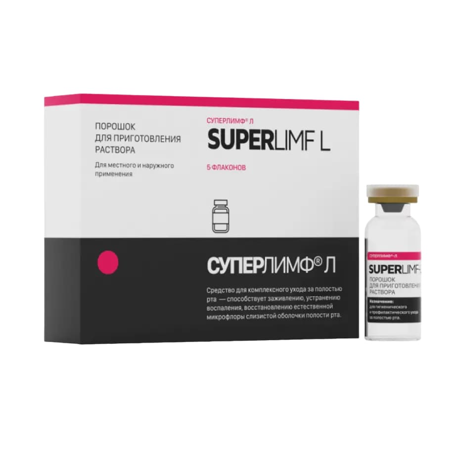 Ознакомиться с аннотацией. Перед применением "Суперлимф Л" провести гигиену полости рта.Вскрыть флакон, добавить 5 мл воды (чайная ложка) и размешать до получения однородного раствора. Полученный раствор нанести на проблемные участки слизистых. Рекомендуемое время экспозиции 3-7 минут. Полученный раствор использовать в течение суток, хранить в холодильнике при температуре от 2 до 8 °С.После применения "Суперлимф Л" не рекомендуется принимать пищу и напитки в течение 1 часа.Средство для местного применения. Не предназначено для приема внутрь.Применять 1-2 раза в день в течение 5-10 дней. Курс и частота могут быть увеличены по рекомендации специалиста. При необходимости курс применения можно повторить.